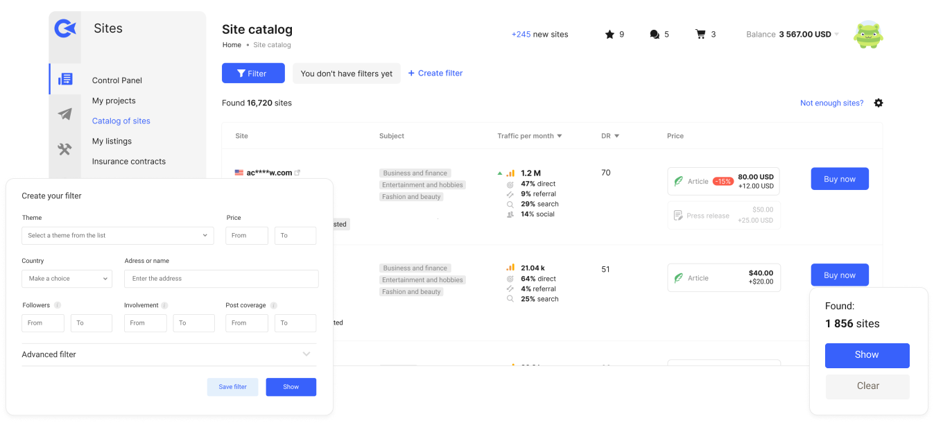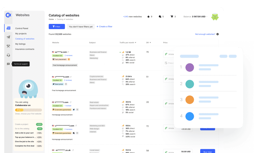 Collaborator brings together websites with high domain authority in one place and offers a comprehensive filter to sort them according to your needs.